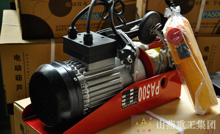 PA500微型電動葫蘆為山燕重工主打微型電動葫蘆之一,分運行式微型電動葫蘆與固定式微型電動葫蘆,可選擇單鉤或者雙鉤版本。單鉤額定起重量為250kg,起升速度10m/min,起升高度可達12m;PA500雙鉤微型電動葫蘆額定起重量可達500kg,起升速度5m/min,起升高度5m。